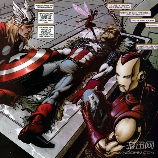之后又在医疗者兹莎姬的作用下复活了。随着故事的进展,毁灭博士(Doctor Doom)获取了超越者的力量,并在战斗中把美国队长撕成了碎片。直到结局,被超越者占据了身体的克洛(Klaw)才帮助美队重新回到了人间。