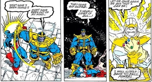在《无限手套#4》的故事中我们可以看到,灭霸一巴掌把美队扇倒在地上,随之借助无限手套的力量用意念清空了战场,美国队长也随之不见。不过在以后的故事中,美国队长还是借由无限手套重新复活,正义的未来也因此有了一线生机。
