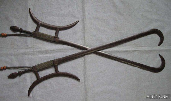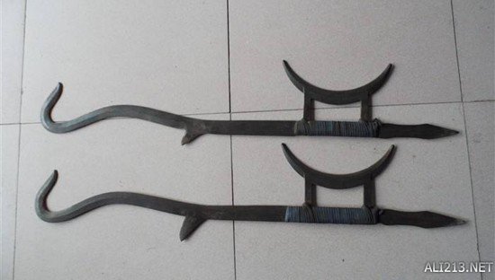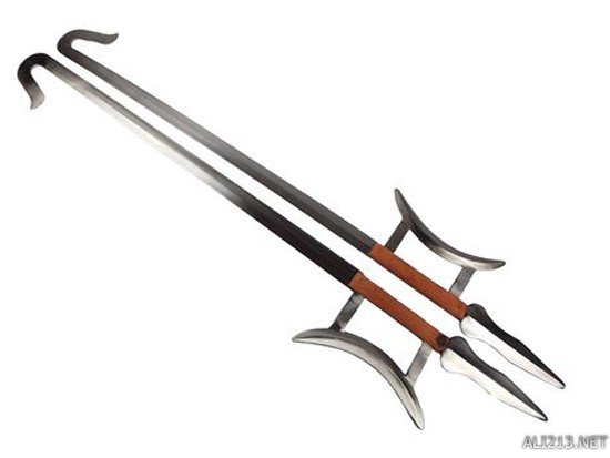 造型独特的中国钩剑,其护手部分也十分尖锐,多数情况下是双剑合并使用。两把这样的钩剑很容易把对方大卸八块。