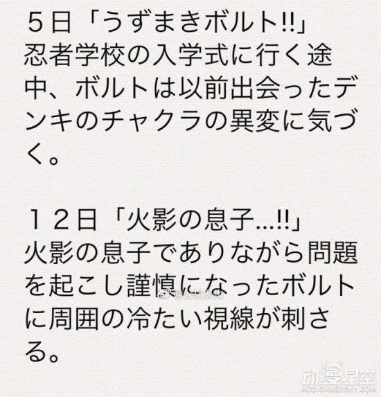 《火影忍者:博人传》马上就要开播,近日官方公开了本作第1、2集的简易剧情。之前的PV中博人遇到的那个少年是个查克拉异变的新角色,名叫雷门电气,总感觉这个少年应该是拥有雷电属性的能力,不知道之后他会和博人他们发生什么。而在第2集中,剧情似乎又开始走《火影忍者》得老套路,博人身为火影的儿子却不断恶作剧,被学校停课、被罚在家闭门反省,这样博人开始受到村人的冷眼对待。