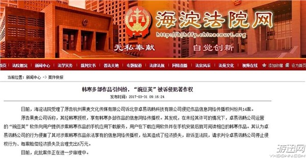 版权问题问题目前是一个备受关注的话题,无论是媒体、网站还是其他行业,稍不留神就会出现侵权问题,因此现在的版权之争非常激烈。据海淀法院通报,杭州麦果文化传媒有限公司起诉豌豆荚侵犯作品信息网络传播权,未经授权传播韩寒作品,要求赔偿5万元。