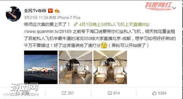 之前夸下海口说要带你们坐私人飞机,明天我花重金租了目前私人飞机中最牛逼的湾流550给大家直播北京-成都,想学习如何好好装b的千万不要错过!好了这波逼装完了请打分[挖鼻](黑粉可以开始喷了)