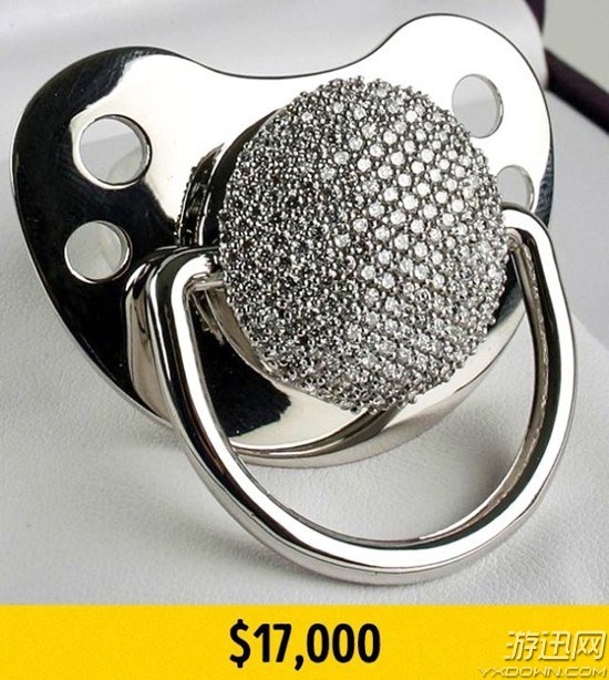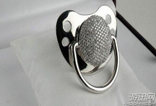 这个全世界最贵的奶嘴是采用矽利康材质制作,它的把手部分是白金,上面还镶有280颗钻石。