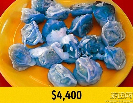 内馅采用深海灯笼鱼肉,所以呈现蓝色。是纽约高档餐厅 Golden Gates 推出的全球最贵水饺。
