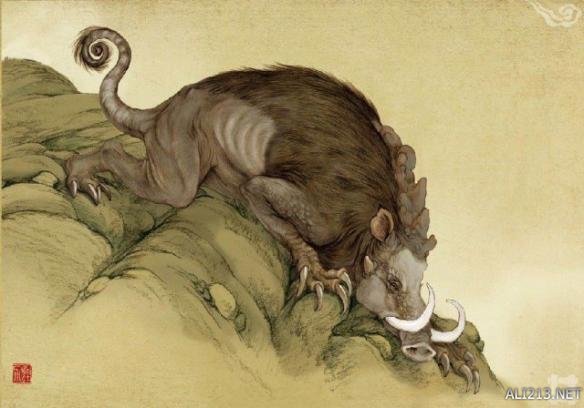 櫃山上的畏兽,样子像猪,四肢却长出了爪子,带有锯齿。见到它的地方,地面多起伏,所以猜测狸力善于挖土。