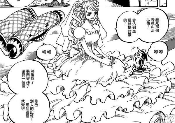会场运进来了一个巨大的婚礼蛋糕,在场的欢声鼎沸。文斯莫克一家的座位周围都被大妈的孩子们包围了,蕾玖自觉无处可逃,已认命。路飞好不容易醒来赶往会场,结婚仪式开始。卡塔库栗看到了布琳哭得崩溃的未来,感到很困惑。