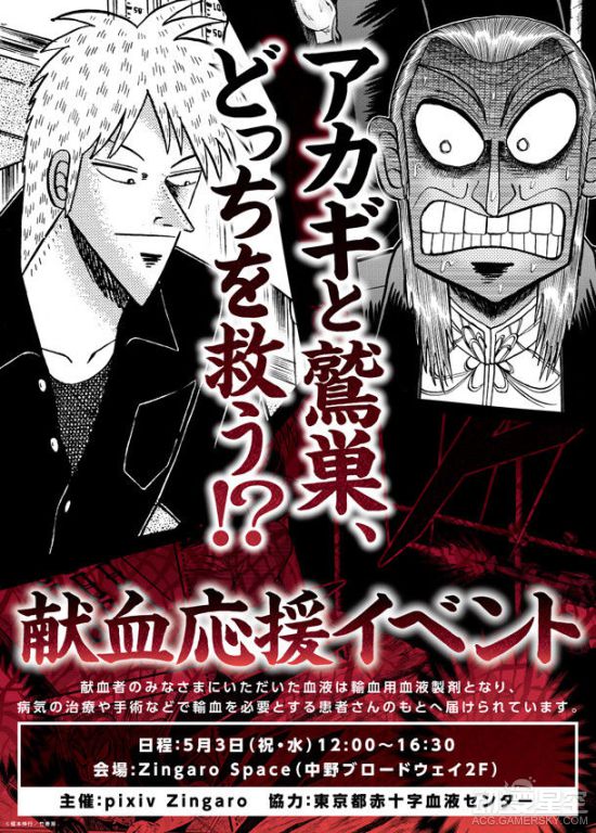 漫画《斗牌传说》前不久刚宣布要在2018年完结,近日又宣布将与日本红十字会展开联动,进行一次献血活动。看过本作的朋友都知道,在本作中有主人公赤木茂与鹫巢采用血液作为筹码进行麻将对决的情节,而这次献血活动也将以此为主题。