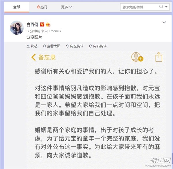 白百何微博表示:“感谢所有关心爱护我们的人,让你们担心了。对这件事情给羽凡造成的影响感到抱歉,对于安保的四位爸爸妈妈感到抱歉。在孩子面前我们永远是一家人。希望大家给我们一点你时间和空间,把我们的家事留给我们自己处理。婚姻是两个家庭的事,处于对孩子成长的考虑,为了给元宝的童年一个完整的家庭,我们没有对外公布这一事实。为此给大家带来的所有麻烦,向大家诚挚道歉。”