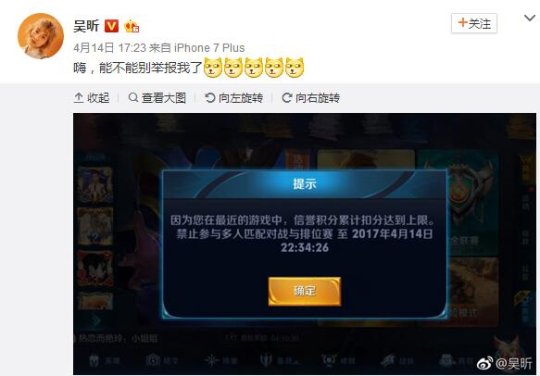 近日,喜欢玩王者荣耀的吴昕由于经常被举报,再次被封20多个小时。她在微博向网友们诉苦:“能不能别举报我了”。从吴昕所放出来的截图中可以看到,消极比赛(挂机)、被举报、信誉积分被扣光了,被禁止参与多人匹配和排位赛。
