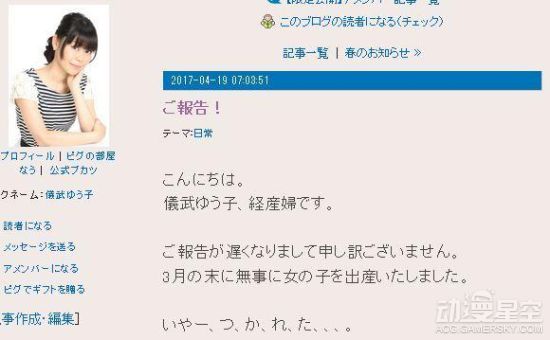 最近有不少声优成为了妈妈,动画《玉响》樱田麻音的声优仪武佑子也于今日(4月19日)在博客上向粉丝报告,她已在3月末诞下一位千金,漫画《学生会长是女仆》的作者藤原飞吕还专门为其女画了一张贺图。