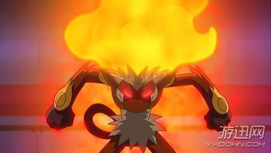 烈焰猴,手脚上都缠绕着火焰,能使出独特的格斗技,不论什么样的对手都能应付。头上燃烧着火焰的性格激烈豪放的口袋妖怪,拥有非常自信的速度。