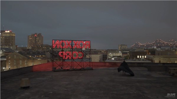 电视剧版画面,“斗篷”标志装备,旁边为Roxxon石油公司,钢铁侠、复联电影,神盾局、夜魔侠电视剧均登场
