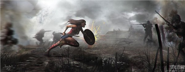 在概念图展示的战场中,神奇女侠第一次露出了她标志性的服装,就像超人撕开衬衫露出S型的LOGO一样,气势十足,美丽又充满了力量。