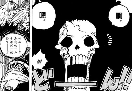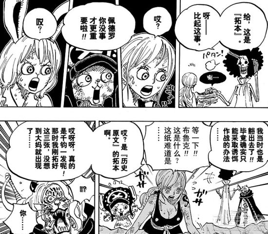 尽管与BIG MOM的战斗异常激烈,但布鲁克居然成功地把历史正文全部拓印了下来,并存放在自己的头骨里!当着力量超强的“三将星”和众多护卫杂鱼的面,布鲁克居然能游刃有余弄到拓本,事后还一副淡定的样子“啊”、“嗯”讲述这些事情,看样子他果然非常可怕,同时极为值得信赖。