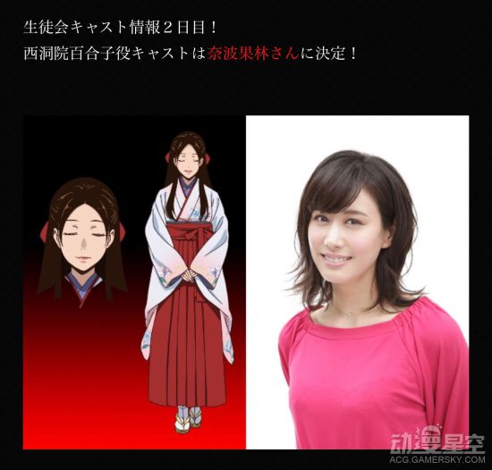 以赌博为题材的TV动画《狂赌之渊》将于7月开播,从昨天(4月25日)起,官方开始一天公开一名角色及声优,继学生会成员皇伊月(CV:若井友希)之后,今天又公开了一位学生会成员,西洞院百合子的声优为奈波果林。