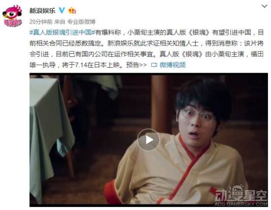 预计7月14日在日本上映的《银魂》真人电影公开新的预告以及全员海报。而近日有消息爆料称:该片将会引进,目前已有国内公司在运作相关事宜,且相关合同已经悉数搞定。新浪娱乐也与相关知情人士进行求证并得到肯定答复。不过目前官方暂未正式公布准确消息,动漫星空对此也将继续关注。