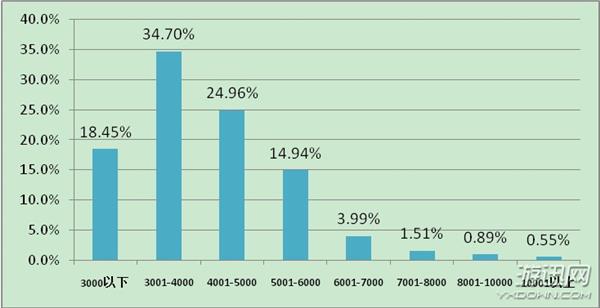 74.6%的人月平均收入在3001-5000元,14.94%的人在5001-6000元,5.5%的人在6001-8000元,月平均收入在8001元以上的占1.44%。