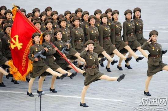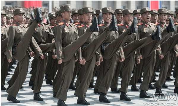 朝鲜军队踢正步是在苏联基础上进行的改进,颇有点特立独行,不摆臂而高踢腿成直角,难度很高。图为朝鲜人民军踢正步。