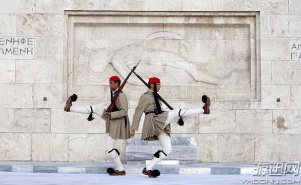 不少国家在士兵换岗、庆典上也有较为夸张的动作,具有一定表演性质,例如希腊,图为希腊士兵换岗。