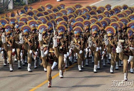 印军踢正步,摆臂高过头顶,腿甚至都踢到了面部。图为印度军队踢正步。