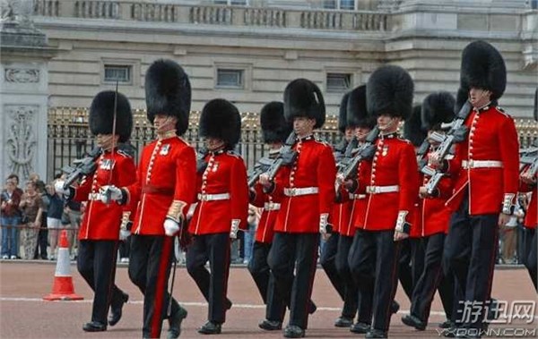 英式正步摆臂幅度较大,但不严格要求腿必须笔直。图为英国皇家卫兵交接。