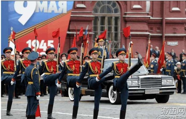 俄罗斯军队踢正步的特点是踢出时腿要与地面成直角,同时将下巴扬起,有傲视天下的自豪感。