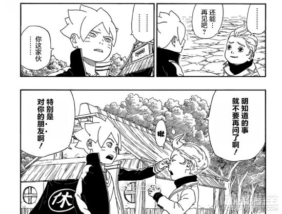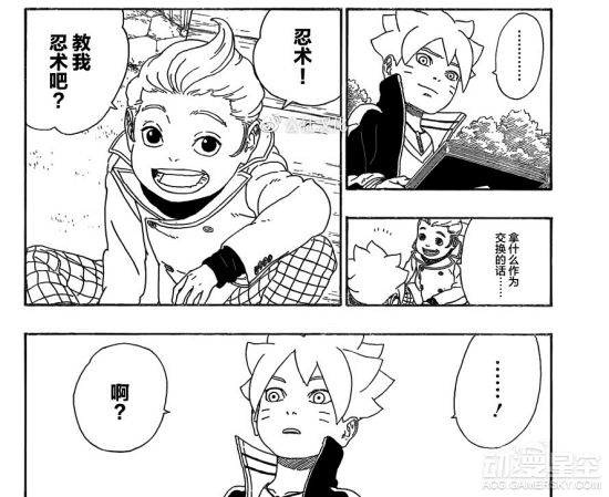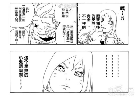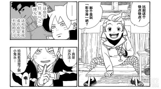 《博人传》漫画第12话汉化版已经出来了,博人担任了火之国大名儿子天统的护卫。天统想要见识下忍者的功夫,博人想要恶作剧一下,使出了色诱术和后宫术。但是这一切却对那个小少爷没啥影响,他表示这种性感风格的看的太多,还是喜欢清纯的。之后天统表示想要学习忍术,但是博人开始并不想教他。二人聊天之后博人从天统身上到了自己的影子,决定教他防身术。