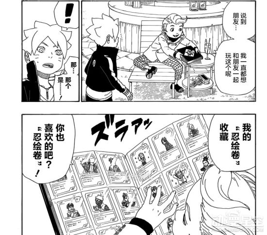 之后天统给博人展示自己“收集”的忍绘卷,卡片的集齐程度非常的高,也是让博人非常羡慕。但是天统却露出了寂寞的神情并且想要学习忍术,原来他的爸爸也是非常的喜欢忍者,天统认为如果自己能够成为一名优秀的忍者,那么父亲可能就会多关注他一些。