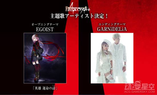 将于今年7月开播的新番《Fate/Apocrypha》近日公布了主题曲详情,人气歌手EGOIST和GARNiDELiA组合将分别为本作献唱OP和ED。新闻详情>>>