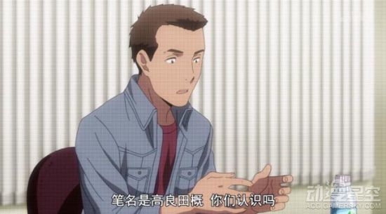 其实这位作者高良田概已经被被自己笔下的角色抓走了,并且在那儿惊恐地求饶。而在最新一集的动画里,出现了这名人物的一张照片,画面当中的他拥有着将整个额头露出来的发型,并且双手做出一副正在比划的样子。而若是我们现在去搜索“虚渊玄”的关键词,就会发现老虚有一张从发型到动作,都跟这个人物一模一样的照片。