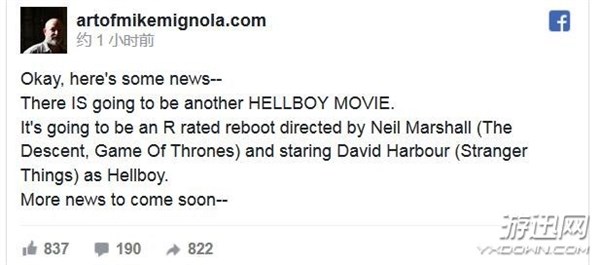 前不久《地狱男爵3》宣布无望时,不少粉丝都十分失望,但现在事情出现了新转机。漫画作者向大家透露,将有一部全新的《地狱男爵》电影,是一部R级的重启之作,将由《权力的游戏》导演拍摄。相信影片质量不会让我们失望。