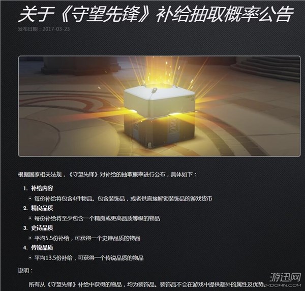 目前,国内《DOTA2》、《英雄联盟》、《守望先锋》、《风暴英雄》、《炉石传说》、《DNF》、《CF》、《阴阳师》、《镇魔曲》、《王者荣耀》等游戏都公开了开箱、抽卡或合成的概率。不过,各家给出概率的方式却不太一样。有的会直接标注某个道具的出现概率为多少,有的则给出的是概率的范围,有些怕玩家懒得算给出了平均开XX个可获得一个某道具的说明。然而,概率本身代表的就是一种期望值和可能性,这并不意味着“一定”。至于有玩家质疑概率的真实性,这倒大可不必,毕竟是国家的政策,谁也不敢弄虚作假。