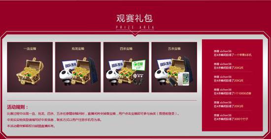 此外,熊猫德杯赛事专题页还为观赛网友准备了万份观赛礼包!IPhone7 Plus、赛睿外设、平台道具、周边礼包、战队签名等珍贵礼品都将随着一血宝箱、抢龙宝箱、四杀宝箱、五杀宝箱而随机掉落。