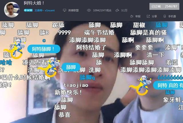 快要闹洞房的时候,有LOL网友起哄:阿特快去舔脚。看来这些都是LOL阿特的真爱粉,连这个梗都知道。(文森特曾经在直播中说打赌输了就舔脚,最后如约直播舔脚底板。)