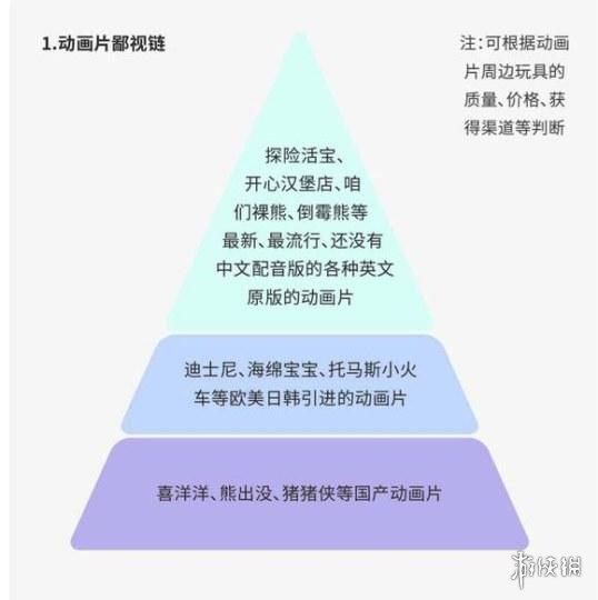 这里的动画片是指所谓的那些中产阶级拿给孩子看的动画作品。从图片上可以看到,第一档的是《探险活宝》《倒霉熊》等作品,另外还有一些英文原版的动画。至于迪士尼作品、《海绵宝宝》等等欧美日韩引进的动画排在了第二档。至于《喜羊羊与灰太狼》《熊出没》等排在了第三档。而之所以会有这样的档次差距,图片表示主要是根据周边的质量、价格、获得渠道来判断的。