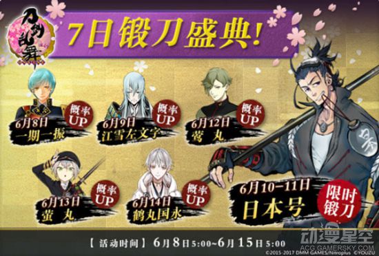 6月8日——一期一振,6月9日——江雪左文字,6月12日——莺丸,6月13日——萤丸,6月14日——鹤丸国永。