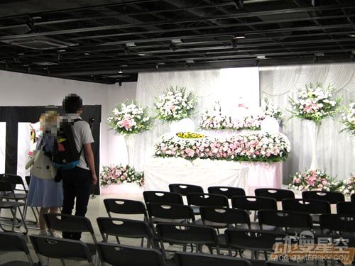 根据看板介绍,参加煌树茉莉香追悼会的观众入场免费,如果准备献花则需要额外支付500日元。进入其中,现场布置得如同真实的追悼会一样,遗照、祭坛、献花台、观众坐席等各种相关设施一应俱全。