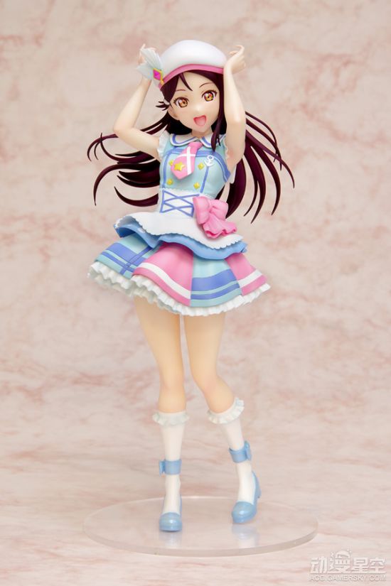 本款梨子手办还原了Aqours一单《你的心是否正在闪耀》的演出服造型和姿势,其中细节的做工非常精巧,包括头发、缎带、裙摆等部位都呈现出强烈的张力和跃动感。此外,手办的帽子还被设计成可脱式,当摘下帽子后,梨子的酒红色长发流泻下来,呈现出另一种妩媚色彩。