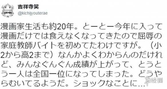 在推特上,吉祥寺笑这样写道:“当漫画家将近20年,今年终于没办法只靠漫画生活了,只好开始屈辱的家教打工”,作为家教,他负责辅导小学二年级到高中二年级的功课内容。