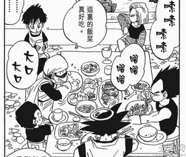 同桌伙伴:孙悟空、孙悟饭与贝吉塔(其他人只是同桌,好像都没吃)
