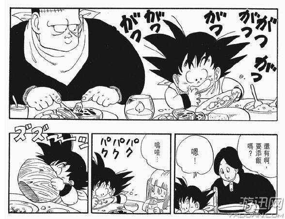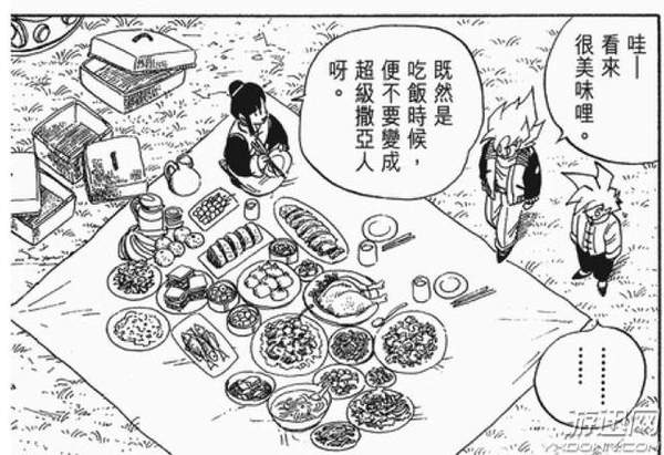 也是七龙珠难得一见的温馨一餐,孙悟空的大气在这里展现无遗,面对强敌,始终不焦虑,孙悟天据说也是在这个时候留下的,战斗了一辈子的伟大战士孙悟空终于在这难得的几天跟一家人一起共享天伦了。其实人生最大的幸福莫不就是如此么?