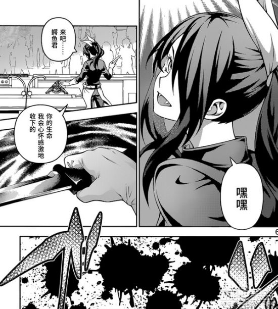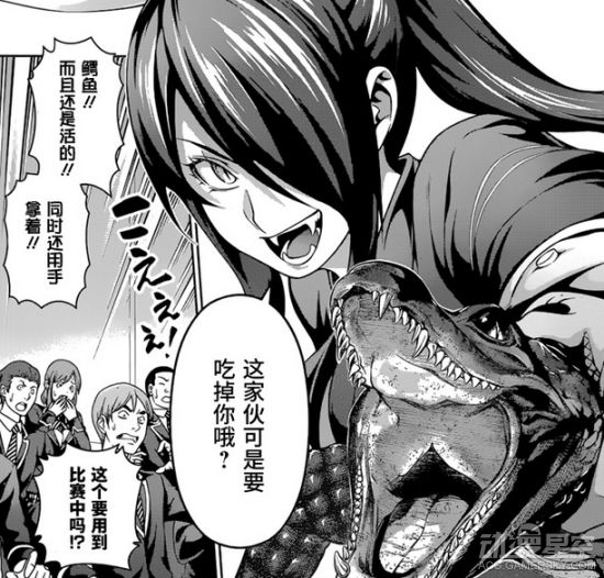 耍帅的样子并没有持续多久,一个小插曲打破了这个气氛——鳄鱼从学姐手中逃脱,在会场中四处乱窜,还好最后乖乖被抓了回来。将鳄鱼固定在料理台上后,龙胆掏出刀迅速将其开膛破肚放血,用熟练的手法了断了鳄鱼的性命。