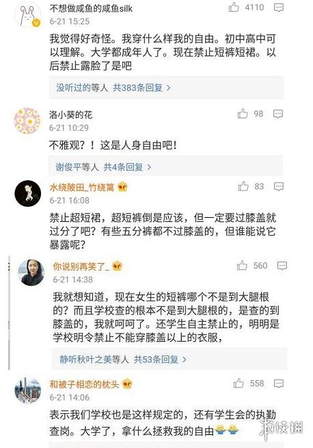 在网上也有人对此事发表评论称,只要着装舒适,不过于碍眼,不违背社会公序良俗,谁都没权力干涉。大学主张个性张扬,不该要求穿着这么保守,而且30多度的高温就该穿凉快点。