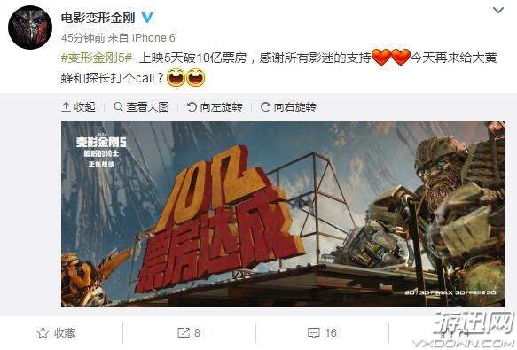 电影变形金刚今天在微博发文,庆贺《变形金刚5》电影上映5天国内破10亿,同时也致谢观众们的支持。新的贺图上是探长和大黄蜂手攀旧车厂屋顶的场景,看上去也是相当喜感。