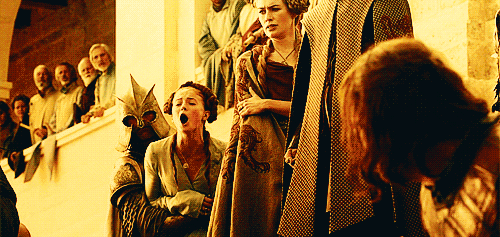 当大提琴拉响,唯一的女人小玫瑰才能在这温柔和平静中嗅到危机四伏企图反抗,可愚蠢的教徒和男人们毫无察觉。这一集的瑟曦一改往常的嚣张跋扈的神情举止,也不再穿艳丽的红色。深沉的黑色长袍金色的图案,精致的短发,含蓄阴沉的微笑喝酒。抛却一切才能得到一切的决绝,缓缓走上了铁王座被安上了最好看的皇冠。