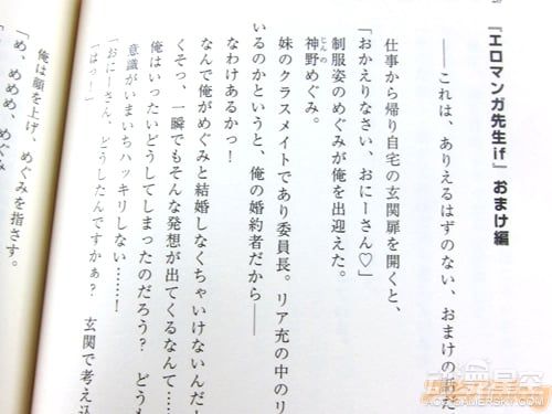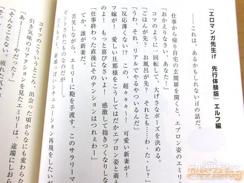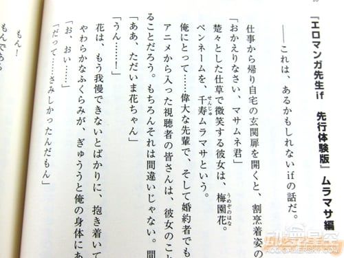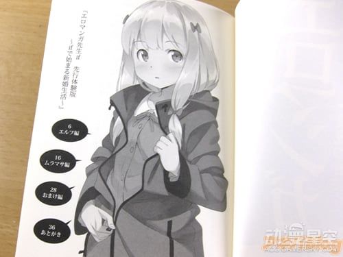 据悉,《埃罗芒阿老师》BD第一卷收录了动画第1话和第2话的高清版本,此外亮点十足的特典包含了全卷收纳BOX、解读手册、和泉纱雾角色歌CD等内容。此外,由伏见司创作的“if”系列短篇小说也正式亮相,先行体验版为《从if开始的新婚生活》,描述了男主角和纱雾、妖精、村征等人幻想结婚的甜蜜场面,各种劲爆段子充斥其中。