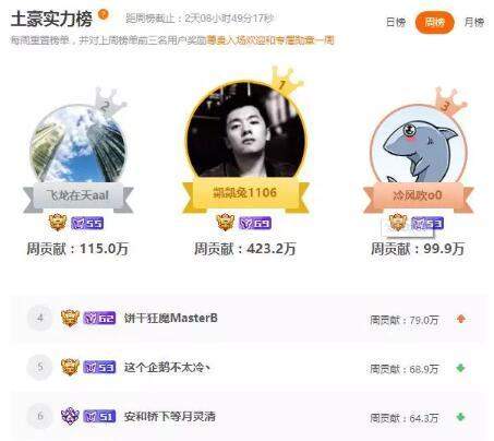 开播第一周,斗鱼土豪榜几乎都被阿冷粉丝占据