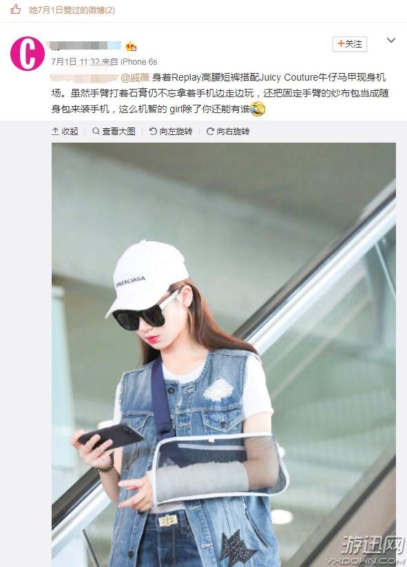 虽然戚薇左手骨折,但是即没耽误了美,又没耽误玩游戏,不仅创意借手,还用纱布包DIY成了装手机的包包。