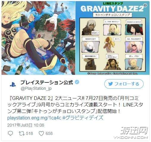 还记得今年1月份上市的PS4动作游戏《重力眩晕2(Gravity Rush 2)》吗?这款上线之初饱受玩家好评的游戏最近又有了新动作,官方宣布,《重力眩晕2》将会在7月27日发售的漫画月刊《月刊コミックアライブ》9月号上推出漫画版,另外LINE图章第二弹“キトゥンがチョロいスタンプ”也已经开始配信。
