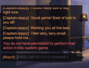不过后来暴雪认为这样嘲讽影响玩家的体验,所以便将这个词和谐成其他文字,如果现在你在游戏中打出GGEZ则会出现类似:“打的太好了,大神请收下我的膝盖!”,“为了鲜血与荣耀,弟兄们!”,“我该睡觉了!别告诉我妈妈!”等有趣而又没有嘲讽意味的语句。